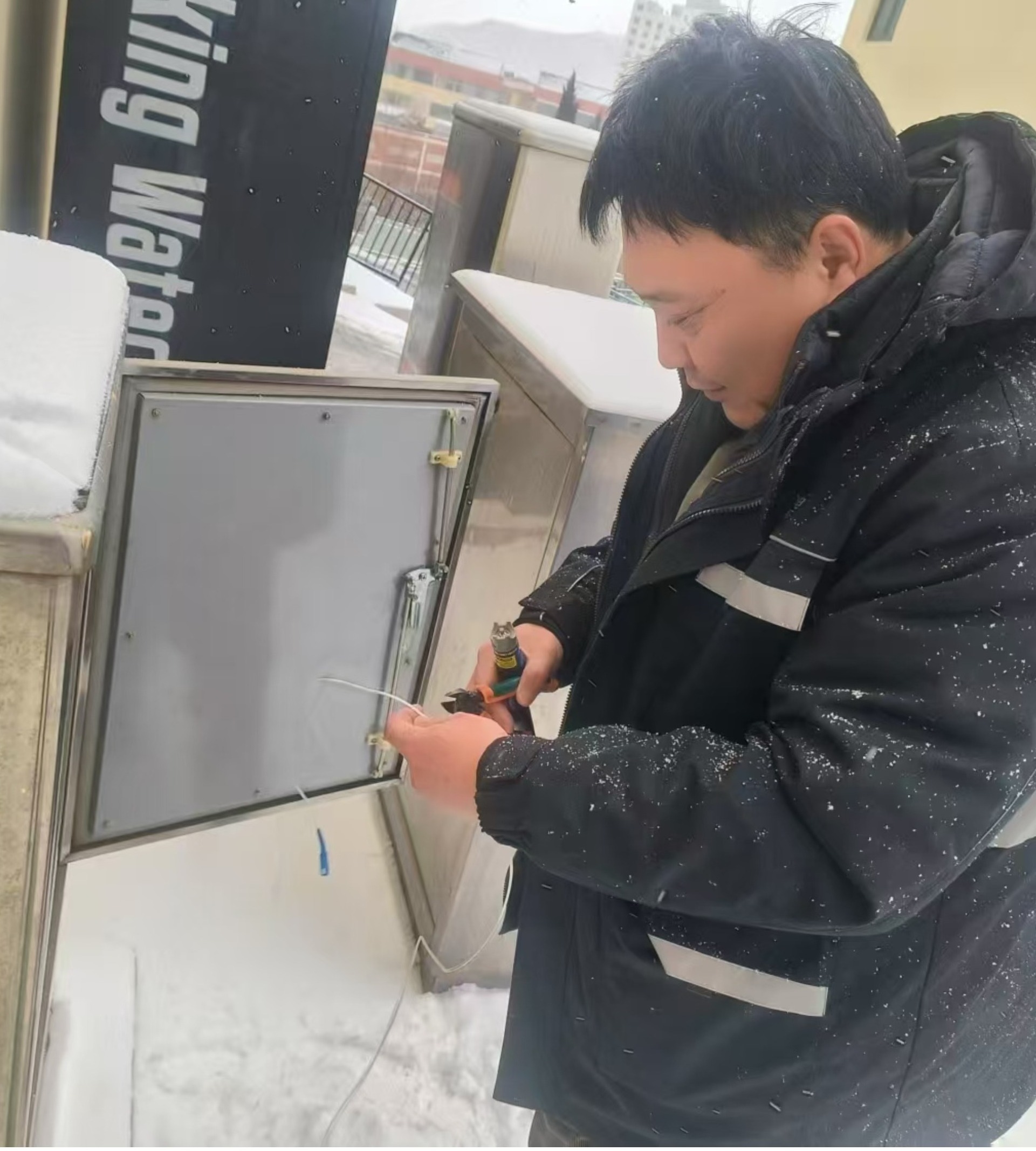 寒潮來(lái)襲,日照莒縣分公司始終堅(jiān)持客戶至上的服務(wù)理念,客戶經(jīng)理接到報(bào)修電話,第一時(shí)間趕到現(xiàn)場(chǎng),進(jìn)行故障排查、信號(hào)恢復(fù),保障客戶收視與上網(wǎng)體驗(yàn)。圖為莒縣分公司直屬營(yíng)業(yè)部客戶經(jīng)理王寶昊在桃園北區(qū)處理信號(hào)故障。